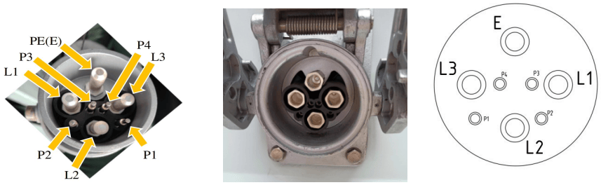 根据国标推荐GB∕T 11918.5-2020图502 250A、350A插头、插座触头布置图(如图1所示,每根供电电缆中的L1、L2、L3为三相供电线,PE(E)为接地线为控制线所示)。