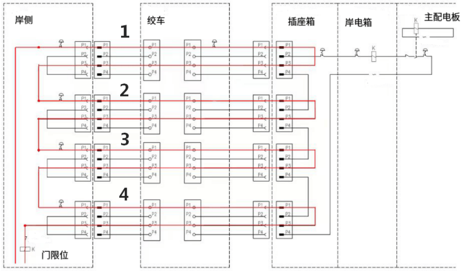 图4 位于船舶岸电船载装置电缆管理系统岸电箱控制回路接线排接线 岸方控制回路岸侧串联后与船方控制回路船方控制回路接线原理图(红线可以看出,不存在不连接的线头,但是此时用欧姆表去测试船舶岸电每根电缆的P1和P3点,会存在每根电缆的这两个点都未连通的问题。根据其线路图作出的原理图(如图5所示)船舶岸电岸方控制回路不通,输出断路器欠压保护动作,导致岸电供电开关不能合闸,从而不能为船舶供岸电。