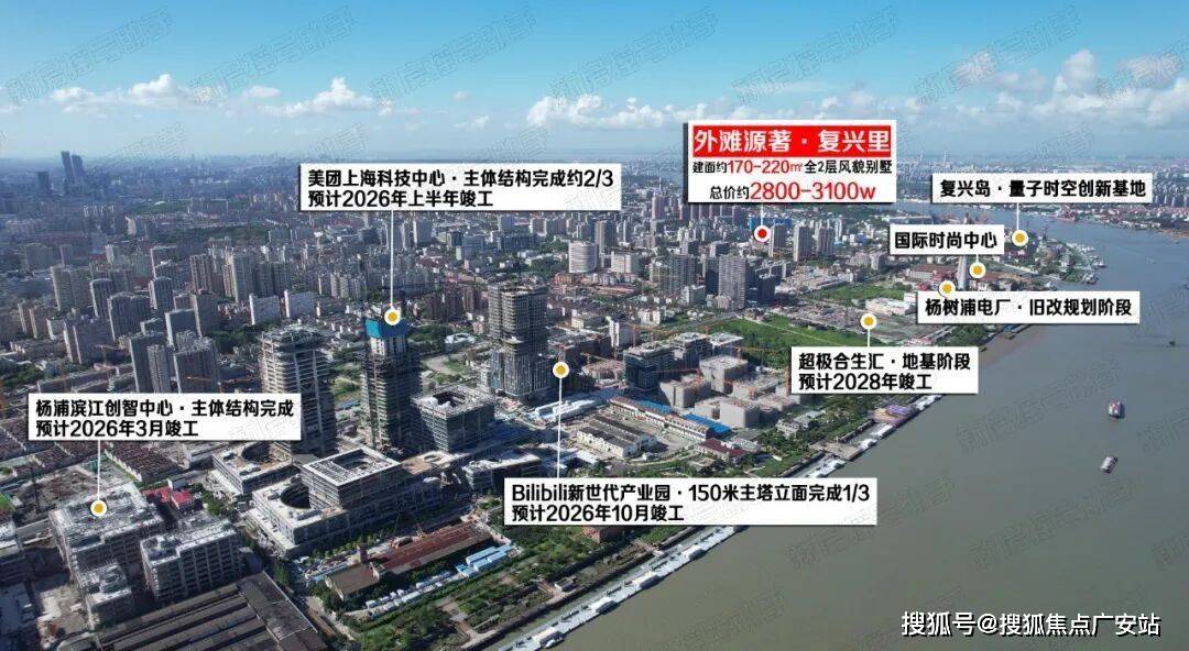 以「外滩源著·复兴里」附近区域来看,超极合生汇目前已处于地基阶段;美团主体结构完成2/3,预计明年上半年竣工;B站新时代产业园150米主塔立面完成1/3,已经初具雏形……2026年竣工在即,万亿产业引擎轰鸣,杨浦滨江岸线正蜕变为世界级“发展绣带”。
