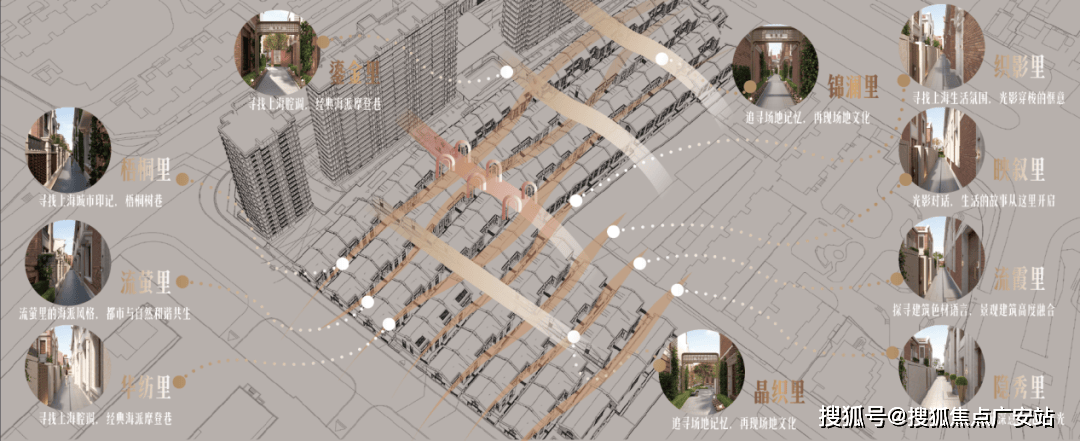 难得的是,项目以“摩登城市的里弄生活”为精神载体,通过对场地历史与上海城市记忆的深度转译,构建了一套独具海派风情的巷道命名体系。整体规划以“鱼骨状”布局为肌理,致敬传统里弄的烟火气与邻里感。