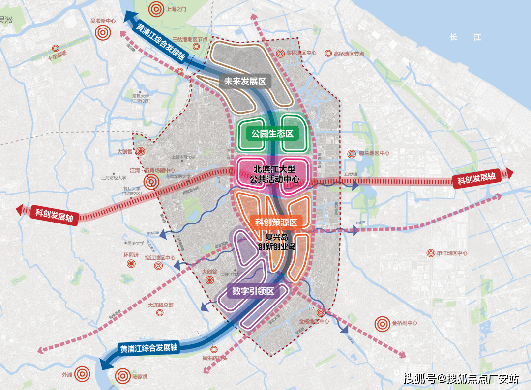 黄浦滨江中北部最新规划“一心”为两轴交汇处形成北滨江公共活动中心。依托黄浦江、复兴岛运河、虬江三水交汇的区位优势 和景观特质,布局标志性的大型体育文化场馆,联动共青森林公园和滨江优质景观资源,塑造文体商旅展一 体化发展的市级滨水公共活动中心。